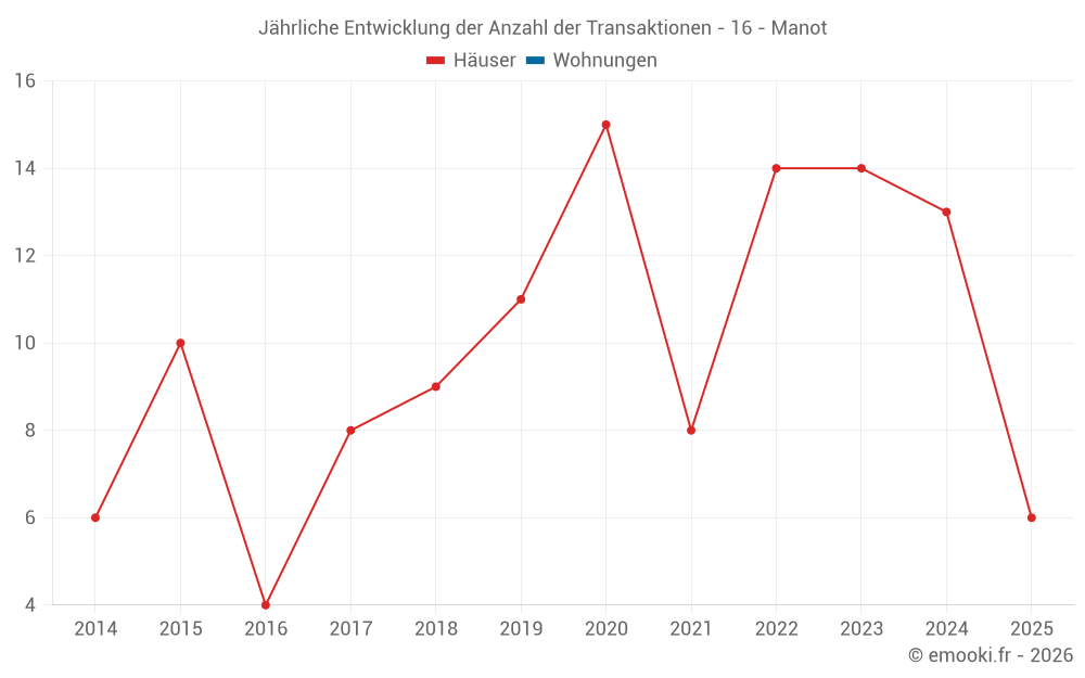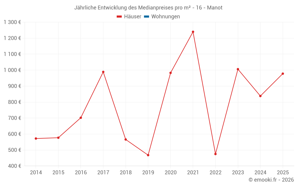 Der Durchschnittspreis auf den 17 Hausgeschäften der letzten 12 Monate in der Gemeinde Manot betrug 909 € pro Quadratmeter für einen mittleren Immobilienwert von 78 700 €. Über diesen Zeitraum hinweg lagen 60% der Transaktionen zwischen 682 und 1 319 € pro Quadratmeter (vom 2. bis zum 8. Dezil).