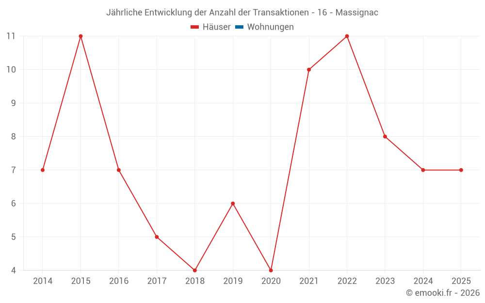 Der Durchschnittspreis auf den 14 Hausgeschäften der letzten 24 Monate in der Gemeinde Massignac betrug 868 € pro Quadratmeter für einen mittleren Immobilienwert von 88 975 €. Über diesen Zeitraum hinweg lagen 60% der Transaktionen zwischen 678 und 1 559 € pro Quadratmeter (vom 2. bis zum 8. Dezil).