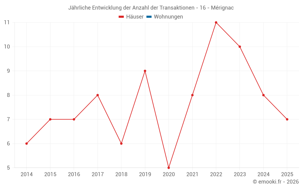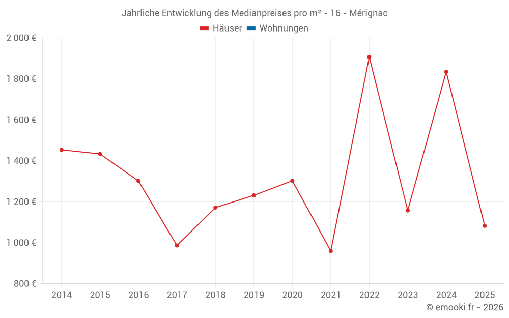 Der Durchschnittspreis auf den 19 Hausgeschäften der letzten 24 Monate in der Gemeinde Mérignac betrug 1 413 € pro Quadratmeter für einen mittleren Immobilienwert von 169 600 €. Über diesen Zeitraum hinweg lagen 60% der Transaktionen zwischen 648 und 2 028 € pro Quadratmeter (vom 2. bis zum 8. Dezil).