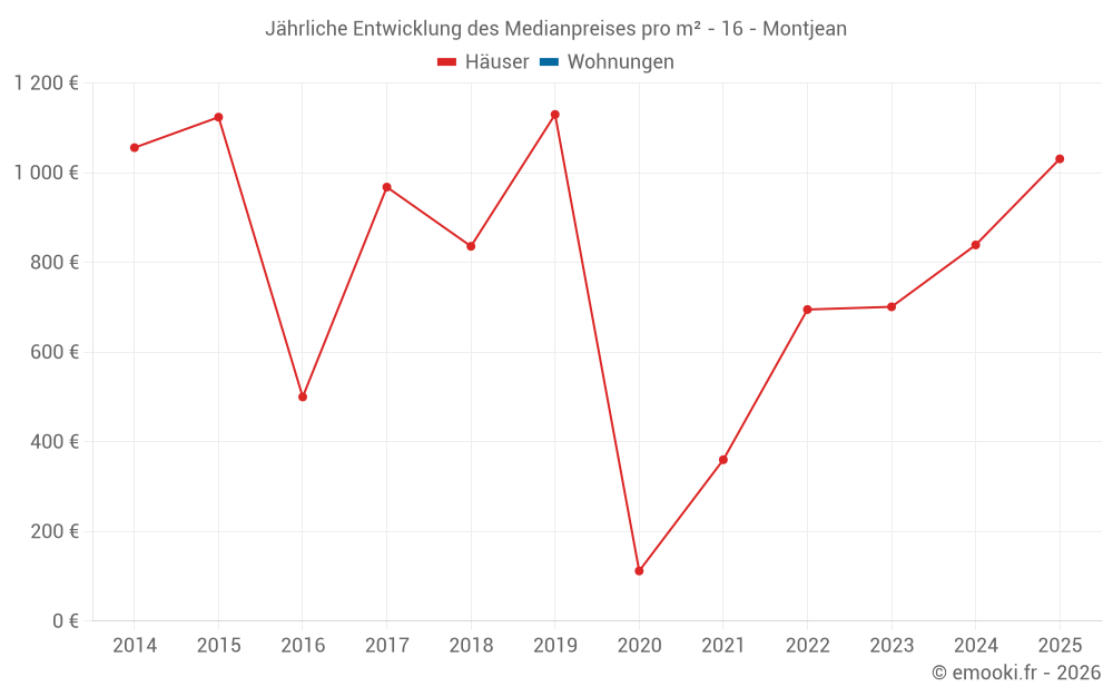 Der Durchschnittspreis auf den 14 Hausgeschäften der letzten 24 Monate in der Gemeinde Montjean betrug 880 € pro Quadratmeter für einen mittleren Immobilienwert von 115 585 €. Über diesen Zeitraum hinweg lagen 60% der Transaktionen zwischen 725 und 1 141 € pro Quadratmeter (vom 2. bis zum 8. Dezil).