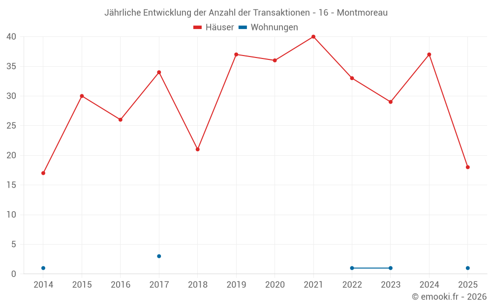 Der Durchschnittspreis auf den 18 Hausgeschäften der letzten 6 Monate in der Gemeinde Montmoreau betrug 1 220 € pro Quadratmeter für einen mittleren Immobilienwert von 127 000 €. Über diesen Zeitraum hinweg lagen 60% der Transaktionen zwischen 753 und 1 521 € pro Quadratmeter (vom 2. bis zum 8. Dezil).