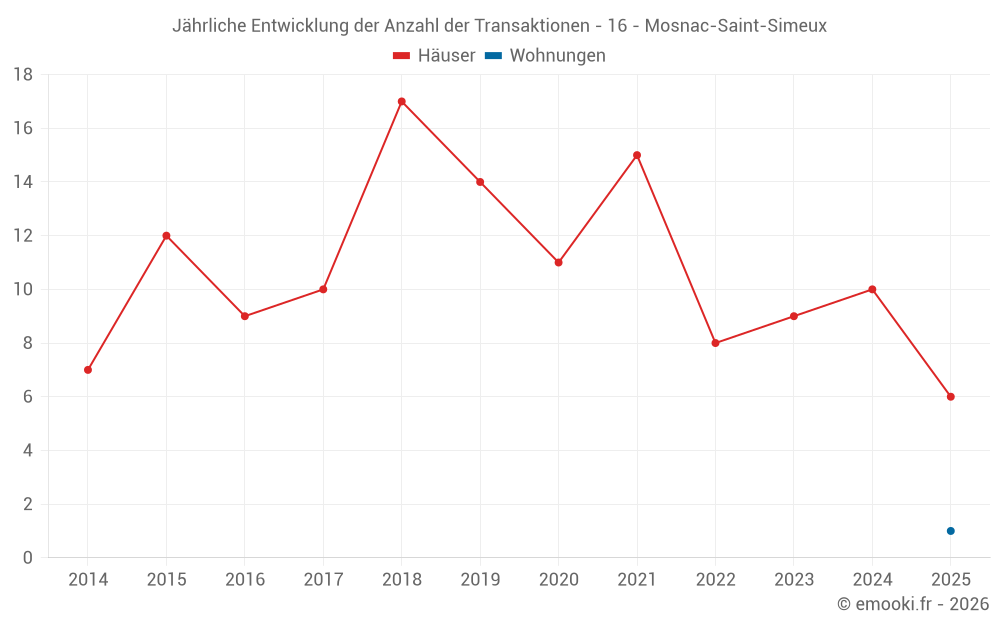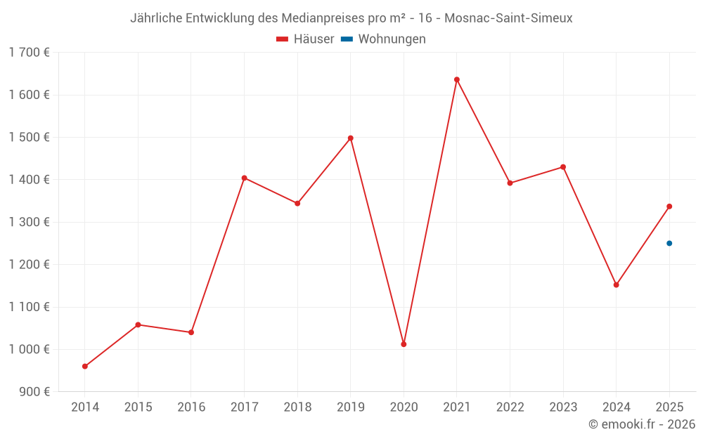 Der Durchschnittspreis auf den 21 Hausgeschäften der letzten 24 Monate in der Gemeinde Mosnac-Saint-Simeux betrug 1 284 € pro Quadratmeter für einen mittleren Immobilienwert von 143 000 €. Über diesen Zeitraum hinweg lagen 60% der Transaktionen zwischen 771 und 1 979 € pro Quadratmeter (vom 2. bis zum 8. Dezil).