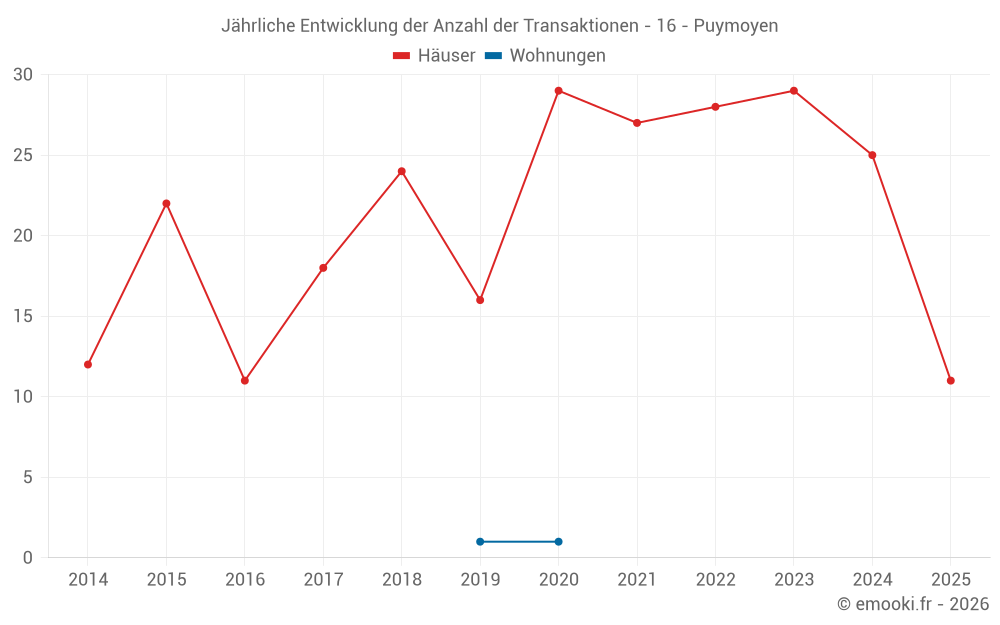 Der Durchschnittspreis auf den 22 Hausgeschäften der letzten 12 Monate in der Gemeinde Puymoyen betrug 1 985 € pro Quadratmeter für einen mittleren Immobilienwert von 214 675 €. Über diesen Zeitraum hinweg lagen 60% der Transaktionen zwischen 1 596 und 2 455 € pro Quadratmeter (vom 2. bis zum 8. Dezil).