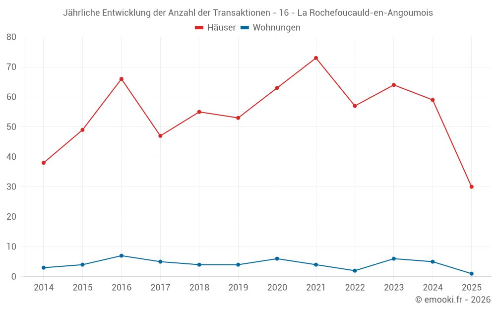 Der Durchschnittspreis auf den 30 Hausgeschäften der letzten 6 Monate in der Gemeinde La Rochefoucauld-en-Angoumois betrug 1 316 € pro Quadratmeter für einen mittleren Immobilienwert von 155 700 €. Über diesen Zeitraum hinweg lagen 60% der Transaktionen zwischen 926 und 1 744 € pro Quadratmeter (vom 2. bis zum 8. Dezil).