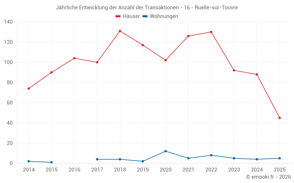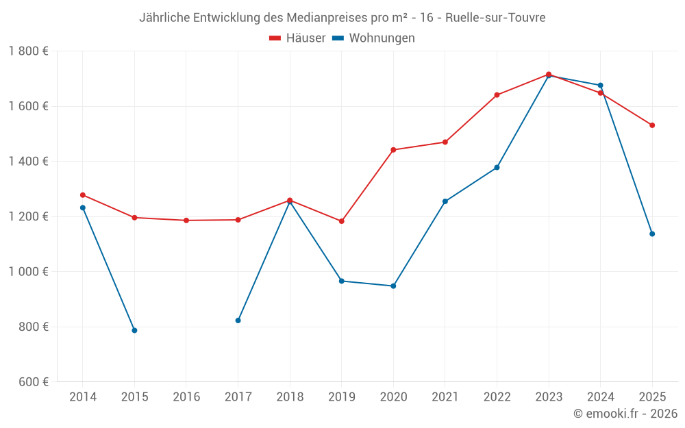 Der Durchschnittspreis auf den 21 Hausgeschäften der letzten 3 Monate in der Gemeinde Ruelle-sur-Touvre betrug 1 456 € pro Quadratmeter für einen mittleren Immobilienwert von 120 000 €. Über diesen Zeitraum hinweg lagen 60% der Transaktionen zwischen 1 241 und 1 719 € pro Quadratmeter (vom 2. bis zum 8. Dezil).