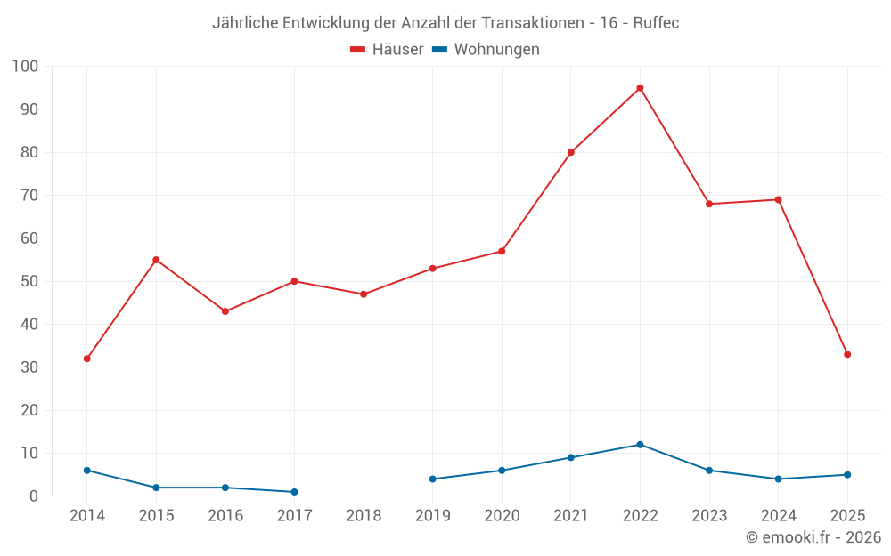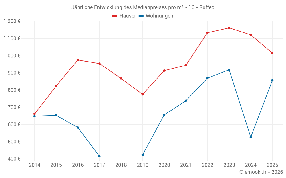 Der Durchschnittspreis auf den 24 Hausgeschäften der letzten 3 Monate in der Gemeinde Ruffec betrug 1 228 € pro Quadratmeter für einen mittleren Immobilienwert von 89 750 €. Über diesen Zeitraum hinweg lagen 60% der Transaktionen zwischen 520 und 1 427 € pro Quadratmeter (vom 2. bis zum 8. Dezil).