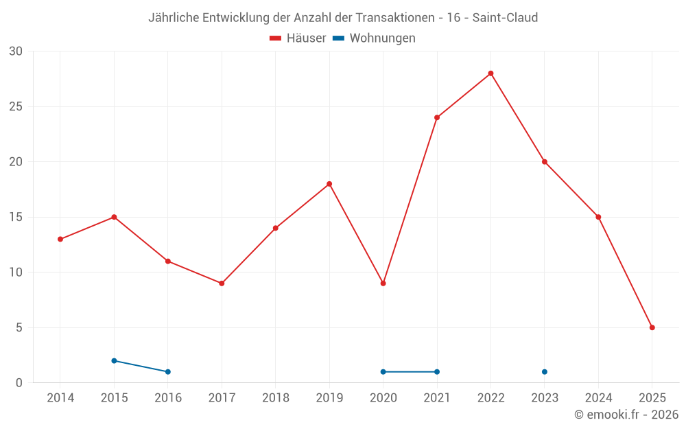 Der Durchschnittspreis auf den 30 Hausgeschäften der letzten 24 Monate in der Gemeinde Saint-Claud betrug 1 052 € pro Quadratmeter für einen mittleren Immobilienwert von 97 988 €. Über diesen Zeitraum hinweg lagen 60% der Transaktionen zwischen 820 und 1 335 € pro Quadratmeter (vom 2. bis zum 8. Dezil).
