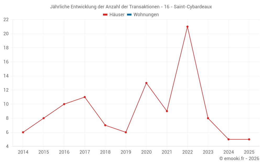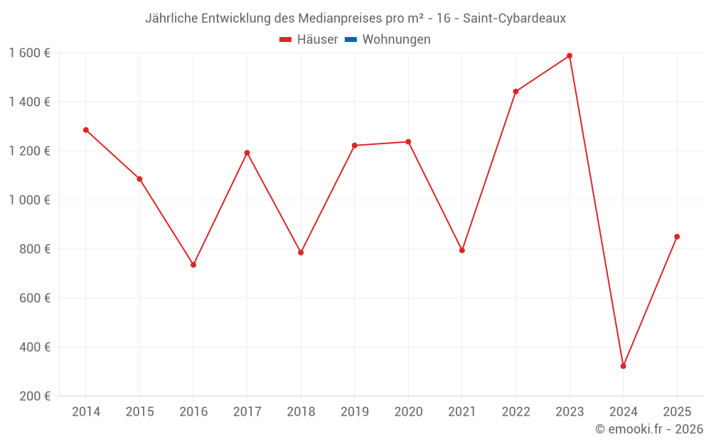 Der Durchschnittspreis auf den 15 Hausgeschäften der letzten 24 Monate in der Gemeinde Saint-Cybardeaux betrug 851 € pro Quadratmeter für einen mittleren Immobilienwert von 74 976 €. Über diesen Zeitraum hinweg lagen 60% der Transaktionen zwischen 518 und 1 498 € pro Quadratmeter (vom 2. bis zum 8. Dezil).