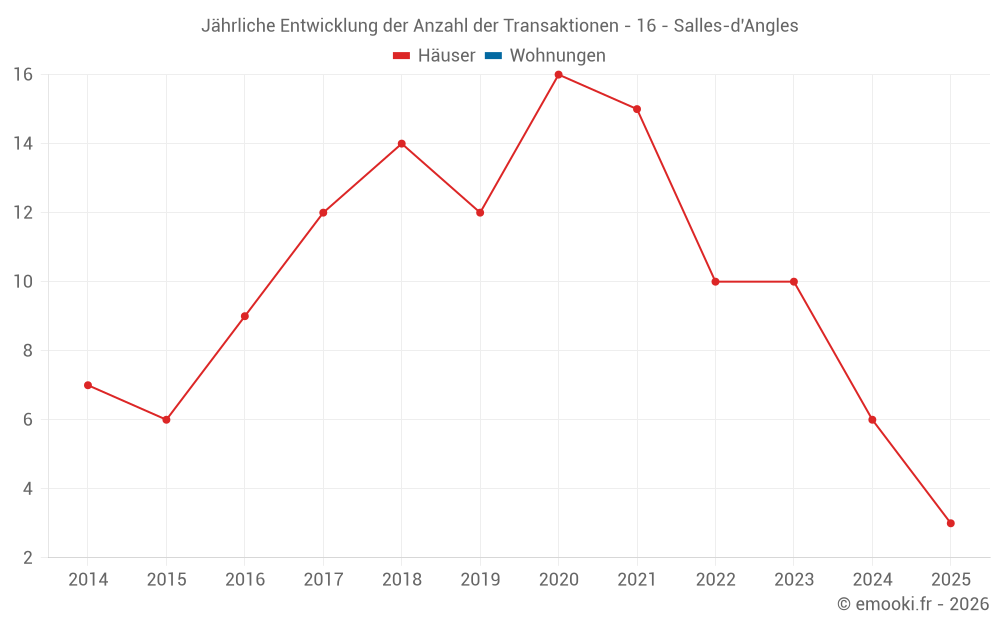 Der Durchschnittspreis auf den 14 Hausgeschäften der letzten 24 Monate in der Gemeinde Salles-d'Angles betrug 1 402 € pro Quadratmeter für einen mittleren Immobilienwert von 164 000 €. Über diesen Zeitraum hinweg lagen 60% der Transaktionen zwischen 786 und 1 877 € pro Quadratmeter (vom 2. bis zum 8. Dezil).