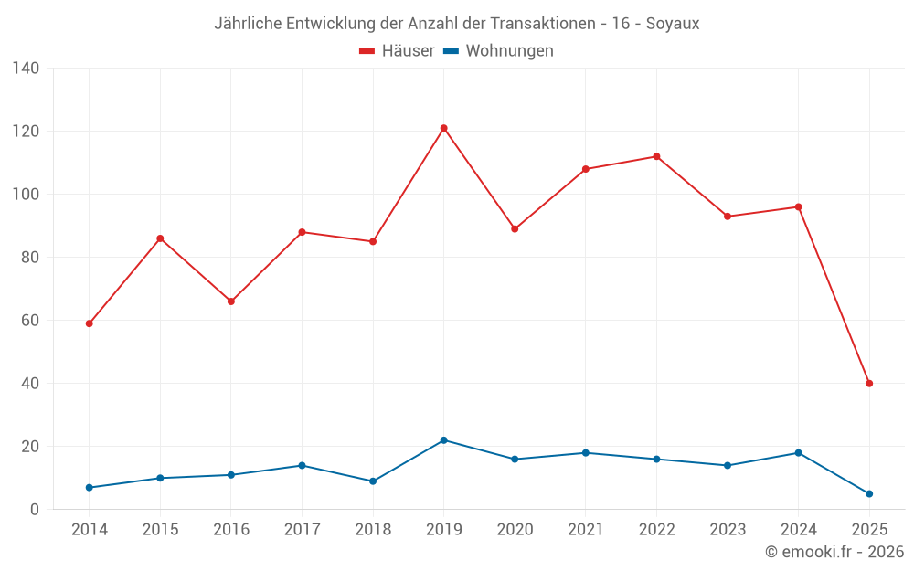 Der Durchschnittspreis auf den 40 Hausgeschäften der letzten 6 Monate in der Gemeinde Soyaux betrug 1 556 € pro Quadratmeter für einen mittleren Immobilienwert von 140 500 €. Über diesen Zeitraum hinweg lagen 60% der Transaktionen zwischen 1 085 und 1 909 € pro Quadratmeter (vom 2. bis zum 8. Dezil).