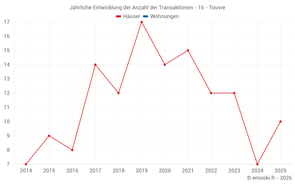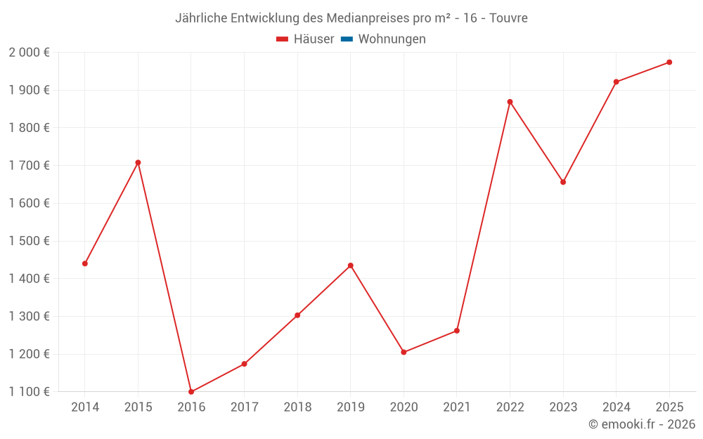 Der Durchschnittspreis auf den 23 Hausgeschäften der letzten 24 Monate in der Gemeinde Touvre betrug 1 705 € pro Quadratmeter für einen mittleren Immobilienwert von 169 000 €. Über diesen Zeitraum hinweg lagen 60% der Transaktionen zwischen 1 300 und 2 249 € pro Quadratmeter (vom 2. bis zum 8. Dezil).