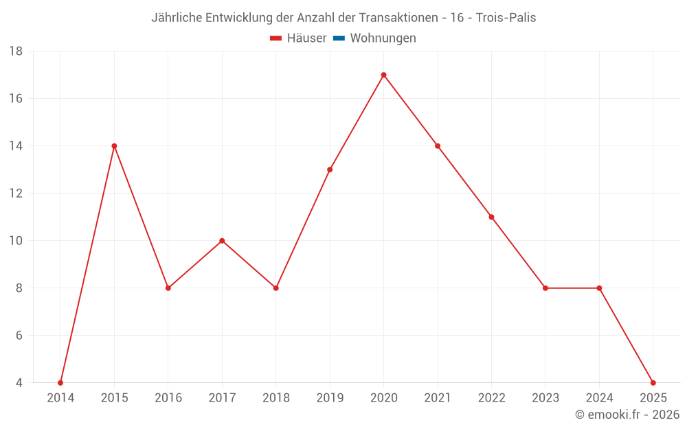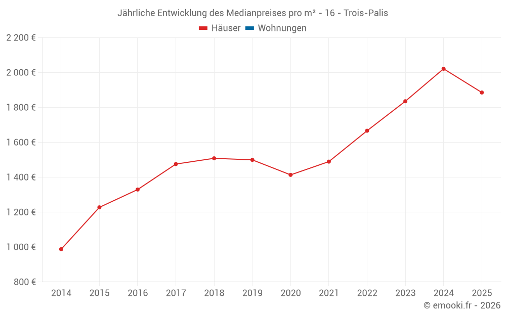 Der Durchschnittspreis auf den 18 Hausgeschäften der letzten 24 Monate in der Gemeinde Trois-Palis betrug 1 886 € pro Quadratmeter für einen mittleren Immobilienwert von 181 000 €. Über diesen Zeitraum hinweg lagen 60% der Transaktionen zwischen 1 645 und 2 199 € pro Quadratmeter (vom 2. bis zum 8. Dezil).