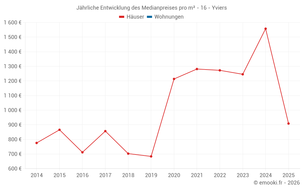 Der Durchschnittspreis auf den 16 Hausgeschäften der letzten 24 Monate in der Gemeinde Yviers betrug 1 390 € pro Quadratmeter für einen mittleren Immobilienwert von 134 875 €. Über diesen Zeitraum hinweg lagen 60% der Transaktionen zwischen 556 und 1 700 € pro Quadratmeter (vom 2. bis zum 8. Dezil).