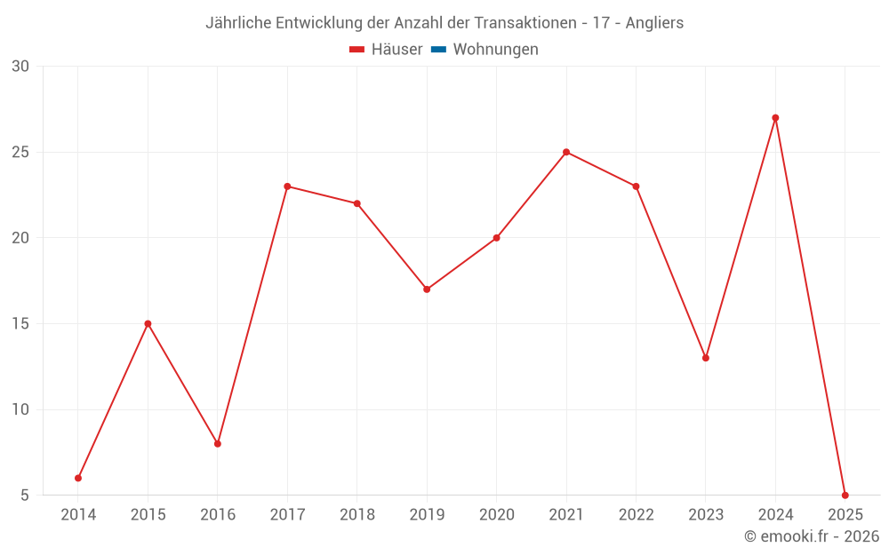 Der Durchschnittspreis auf den 22 Hausgeschäften der letzten 12 Monate in der Gemeinde Angliers betrug 2 996 € pro Quadratmeter für einen mittleren Immobilienwert von 289 264 €. Über diesen Zeitraum hinweg lagen 60% der Transaktionen zwischen 2 449 und 3 467 € pro Quadratmeter (vom 2. bis zum 8. Dezil).
