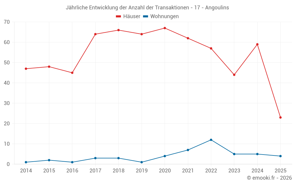 Der Durchschnittspreis auf den 23 Hausgeschäften der letzten 6 Monate in der Gemeinde Angoulins betrug 3 728 € pro Quadratmeter für einen mittleren Immobilienwert von 273 000 €. Über diesen Zeitraum hinweg lagen 60% der Transaktionen zwischen 1 944 und 4 356 € pro Quadratmeter (vom 2. bis zum 8. Dezil).