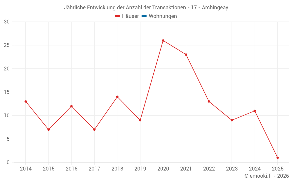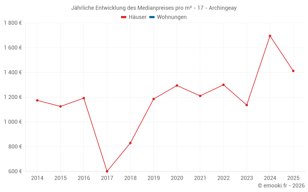 Der Durchschnittspreis auf den 15 Hausgeschäften der letzten 24 Monate in der Gemeinde Archingeay betrug 1 419 € pro Quadratmeter für einen mittleren Immobilienwert von 135 000 €. Über diesen Zeitraum hinweg lagen 60% der Transaktionen zwischen 1 102 und 2 091 € pro Quadratmeter (vom 2. bis zum 8. Dezil).
