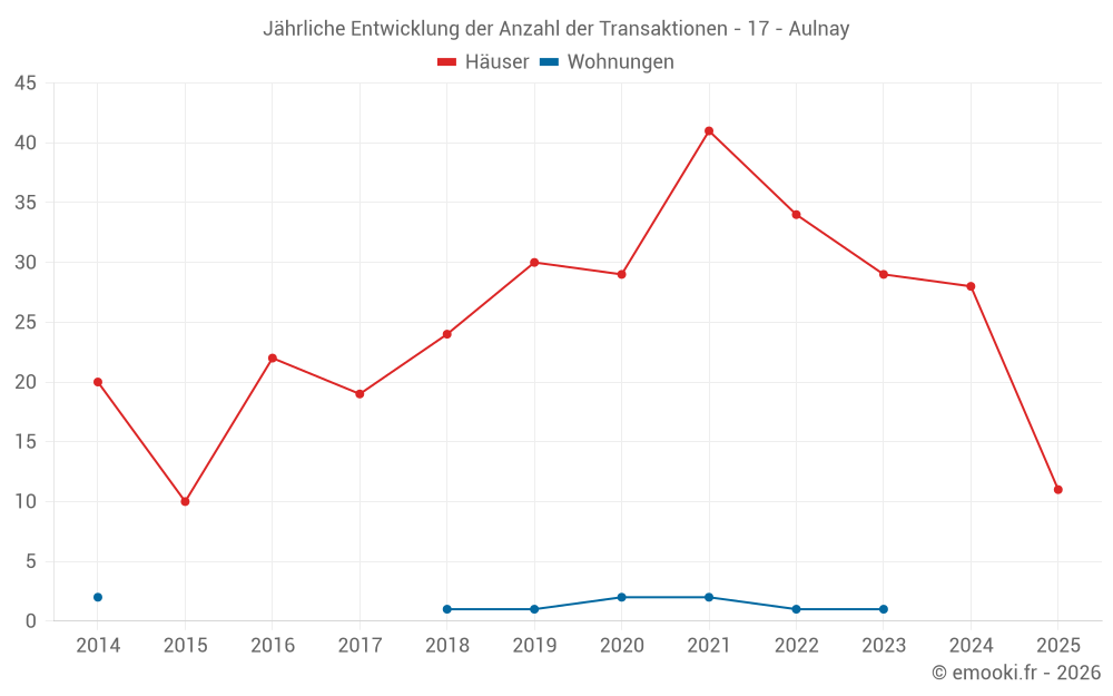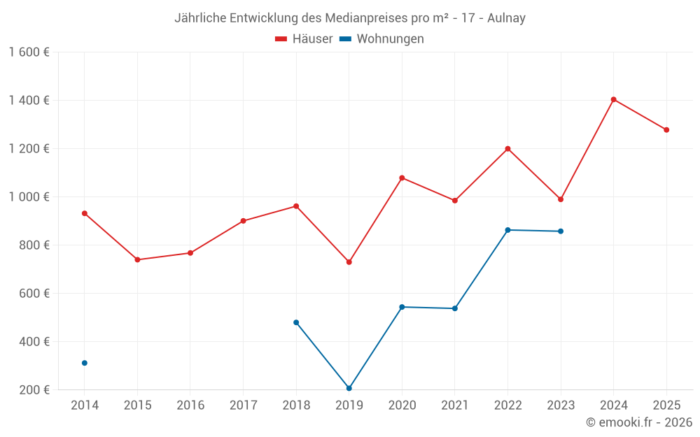 Der Durchschnittspreis auf den 27 Hausgeschäften der letzten 12 Monate in der Gemeinde Aulnay betrug 1 414 € pro Quadratmeter für einen mittleren Immobilienwert von 130 000 €. Über diesen Zeitraum hinweg lagen 60% der Transaktionen zwischen 909 und 1 730 € pro Quadratmeter (vom 2. bis zum 8. Dezil).
