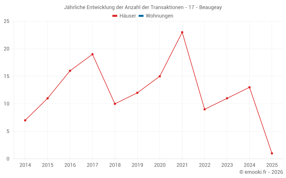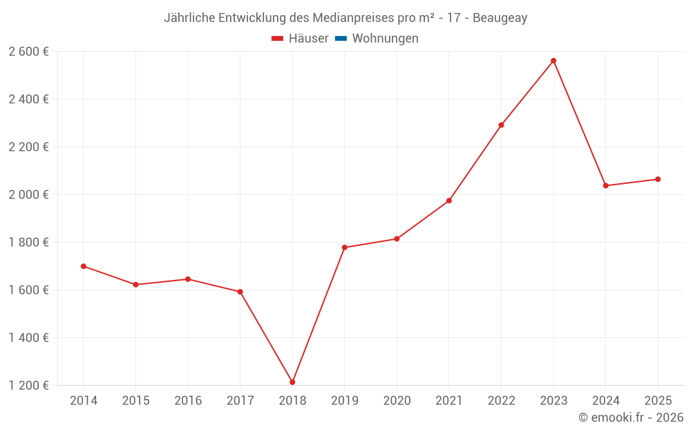 Der Durchschnittspreis auf den 19 Hausgeschäften der letzten 24 Monate in der Gemeinde Beaugeay betrug 2 065 € pro Quadratmeter für einen mittleren Immobilienwert von 232 000 €. Über diesen Zeitraum hinweg lagen 60% der Transaktionen zwischen 1 496 und 2 419 € pro Quadratmeter (vom 2. bis zum 8. Dezil).
