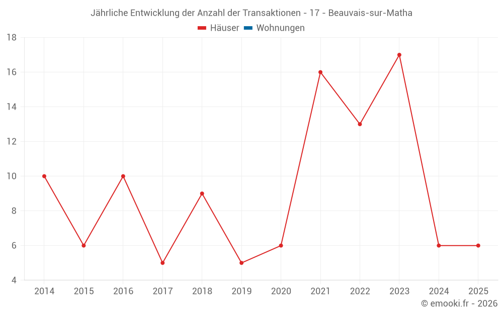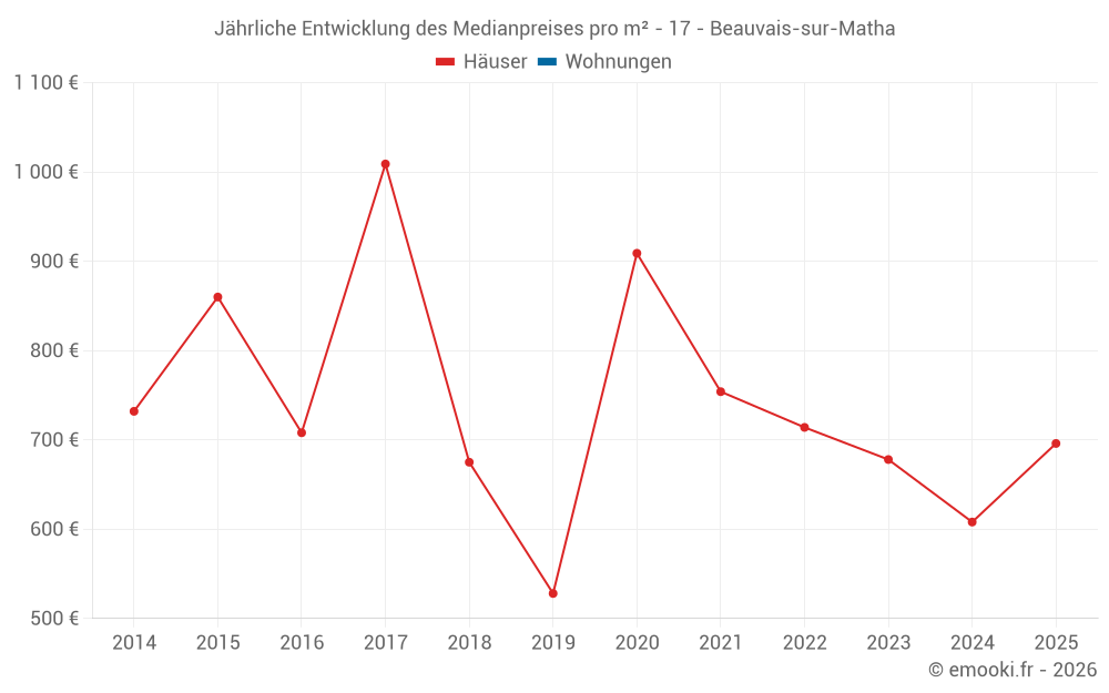 Der Durchschnittspreis auf den 20 Hausgeschäften der letzten 24 Monate in der Gemeinde Beauvais-sur-Matha betrug 632 € pro Quadratmeter für einen mittleren Immobilienwert von 61 500 €. Über diesen Zeitraum hinweg lagen 60% der Transaktionen zwischen 292 und 965 € pro Quadratmeter (vom 2. bis zum 8. Dezil).