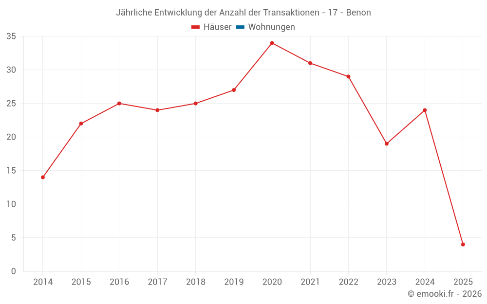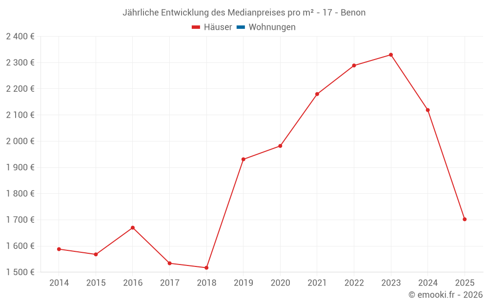 Der Durchschnittspreis auf den 17 Hausgeschäften der letzten 12 Monate in der Gemeinde Benon betrug 2 057 € pro Quadratmeter für einen mittleren Immobilienwert von 230 000 €. Über diesen Zeitraum hinweg lagen 60% der Transaktionen zwischen 1 530 und 2 386 € pro Quadratmeter (vom 2. bis zum 8. Dezil).