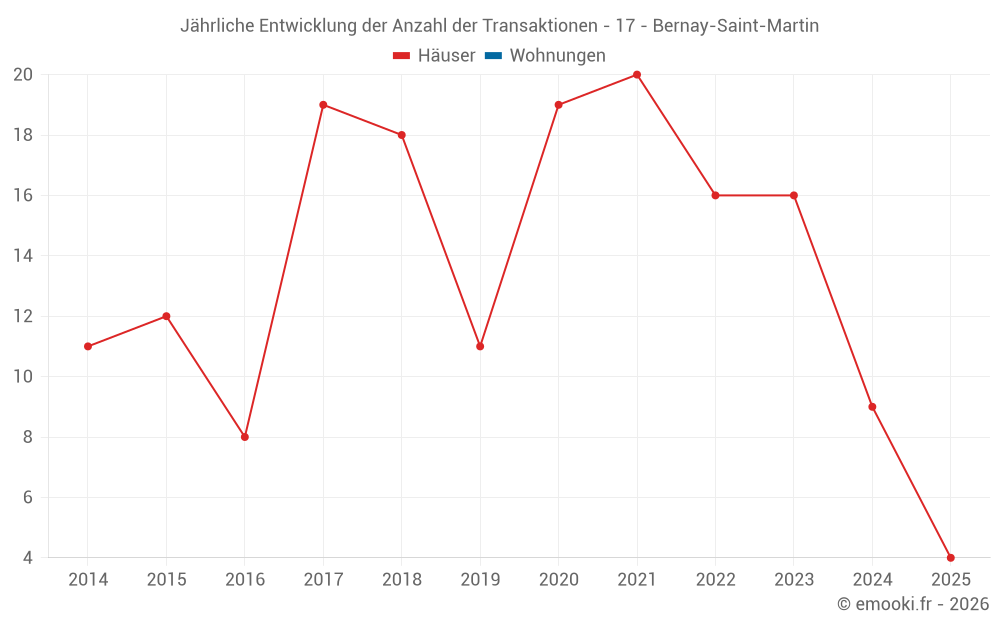 Der Durchschnittspreis auf den 19 Hausgeschäften der letzten 24 Monate in der Gemeinde Bernay-Saint-Martin betrug 1 270 € pro Quadratmeter für einen mittleren Immobilienwert von 101 382 €. Über diesen Zeitraum hinweg lagen 60% der Transaktionen zwischen 1 006 und 1 489 € pro Quadratmeter (vom 2. bis zum 8. Dezil).