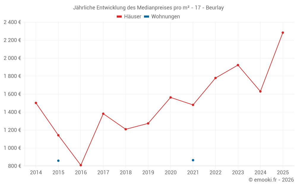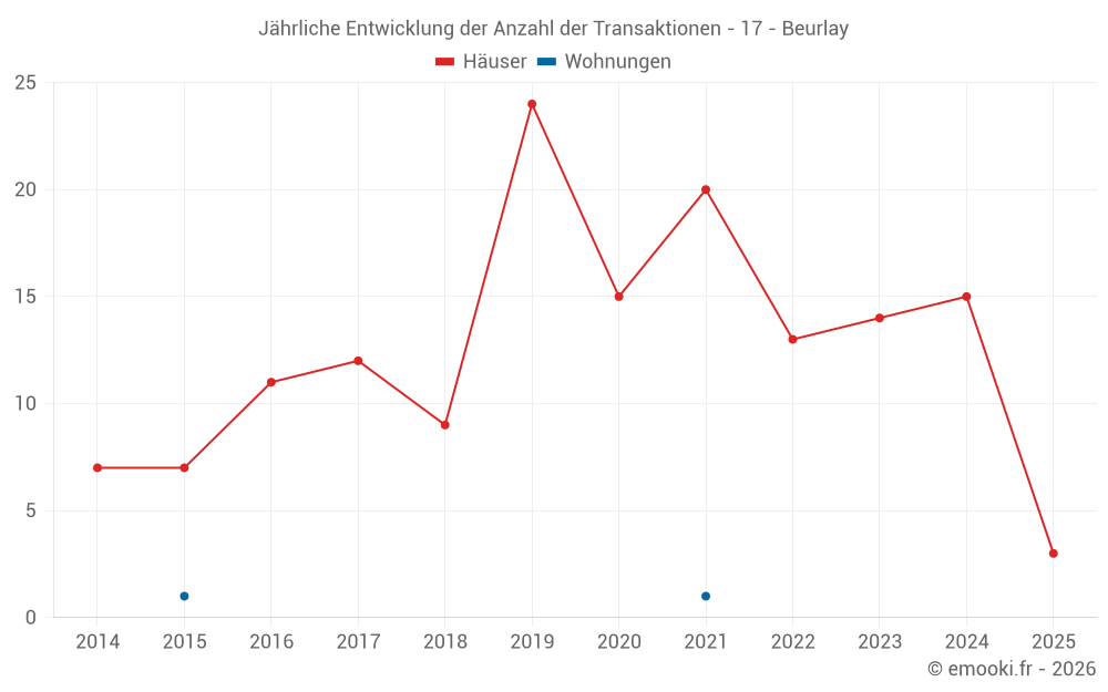 Der Durchschnittspreis auf den 21 Hausgeschäften der letzten 24 Monate in der Gemeinde Beurlay betrug 1 899 € pro Quadratmeter für einen mittleren Immobilienwert von 215 000 €. Über diesen Zeitraum hinweg lagen 60% der Transaktionen zwischen 925 und 2 323 € pro Quadratmeter (vom 2. bis zum 8. Dezil).