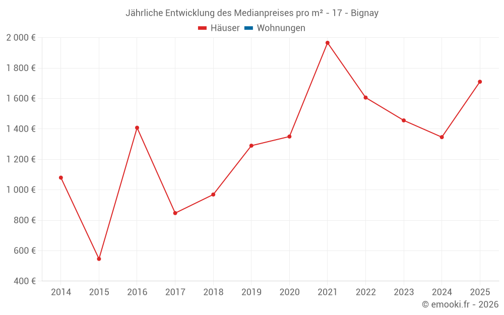 Der Durchschnittspreis auf den 16 Hausgeschäften der letzten 24 Monate in der Gemeinde Bignay betrug 1 445 € pro Quadratmeter für einen mittleren Immobilienwert von 142 500 €. Über diesen Zeitraum hinweg lagen 60% der Transaktionen zwischen 1 133 und 1 818 € pro Quadratmeter (vom 2. bis zum 8. Dezil).