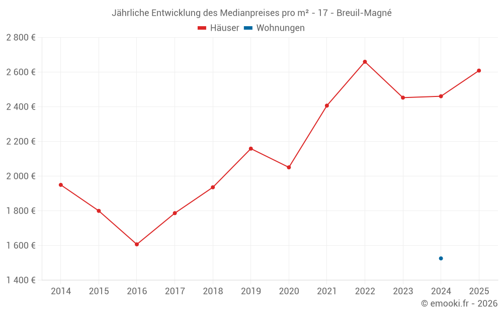 Der Durchschnittspreis auf den 20 Hausgeschäften der letzten 12 Monate in der Gemeinde Breuil-Magné betrug 2 459 € pro Quadratmeter für einen mittleren Immobilienwert von 258 125 €. Über diesen Zeitraum hinweg lagen 60% der Transaktionen zwischen 1 715 und 3 210 € pro Quadratmeter (vom 2. bis zum 8. Dezil).