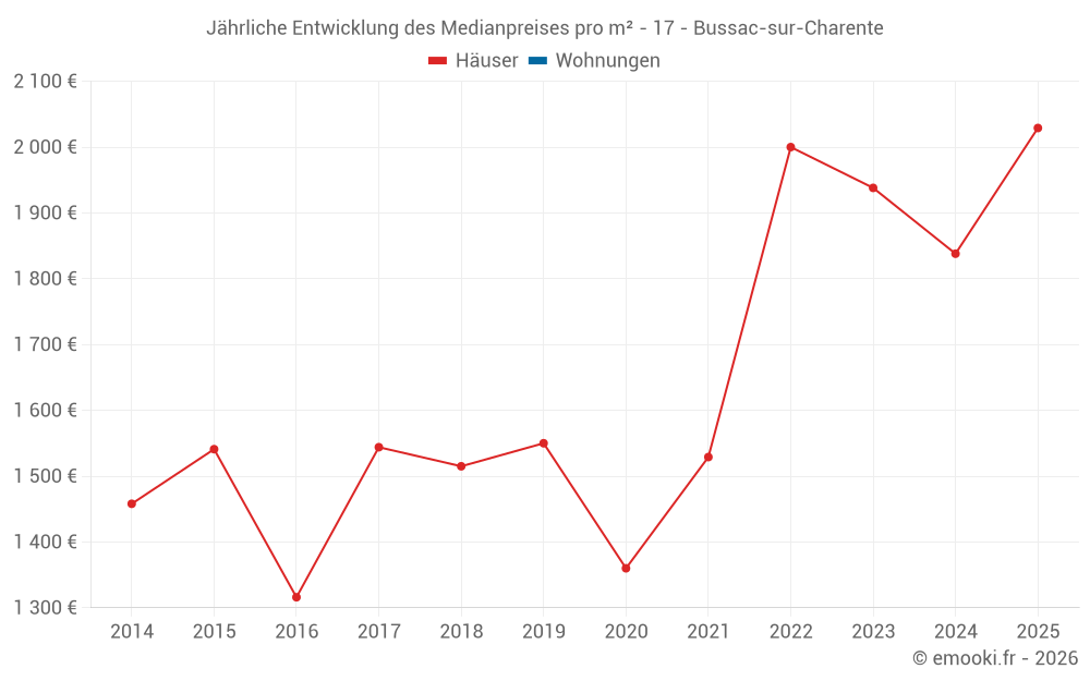 Der Durchschnittspreis auf den 16 Hausgeschäften der letzten 12 Monate in der Gemeinde Bussac-sur-Charente betrug 2 029 € pro Quadratmeter für einen mittleren Immobilienwert von 211 250 €. Über diesen Zeitraum hinweg lagen 60% der Transaktionen zwischen 1 148 und 2 410 € pro Quadratmeter (vom 2. bis zum 8. Dezil).