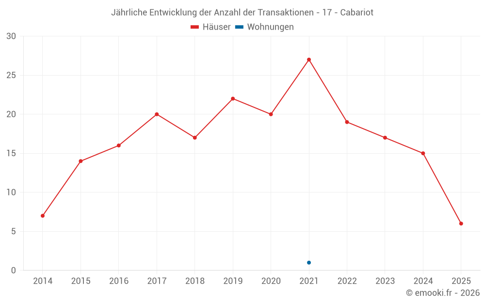 Der Durchschnittspreis auf den 33 Hausgeschäften der letzten 24 Monate in der Gemeinde Cabariot betrug 2 118 € pro Quadratmeter für einen mittleren Immobilienwert von 207 500 €. Über diesen Zeitraum hinweg lagen 60% der Transaktionen zwischen 1 472 und 2 452 € pro Quadratmeter (vom 2. bis zum 8. Dezil).
