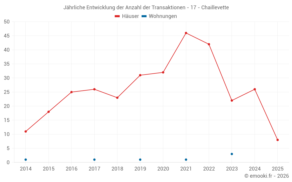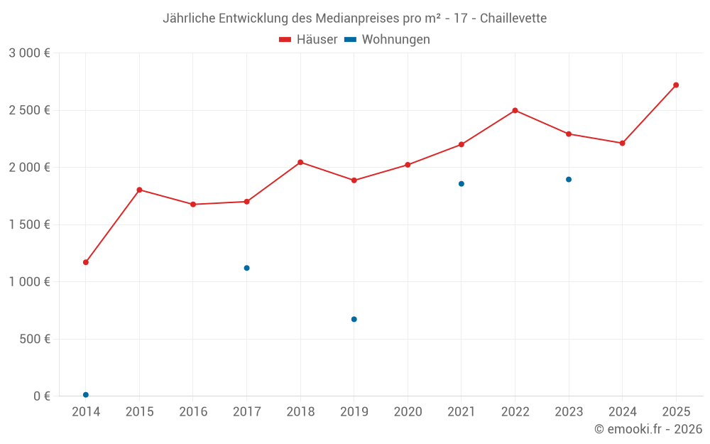 Der Durchschnittspreis auf den 24 Hausgeschäften der letzten 12 Monate in der Gemeinde Chaillevette betrug 2 340 € pro Quadratmeter für einen mittleren Immobilienwert von 220 750 €. Über diesen Zeitraum hinweg lagen 60% der Transaktionen zwischen 1 627 und 3 045 € pro Quadratmeter (vom 2. bis zum 8. Dezil).