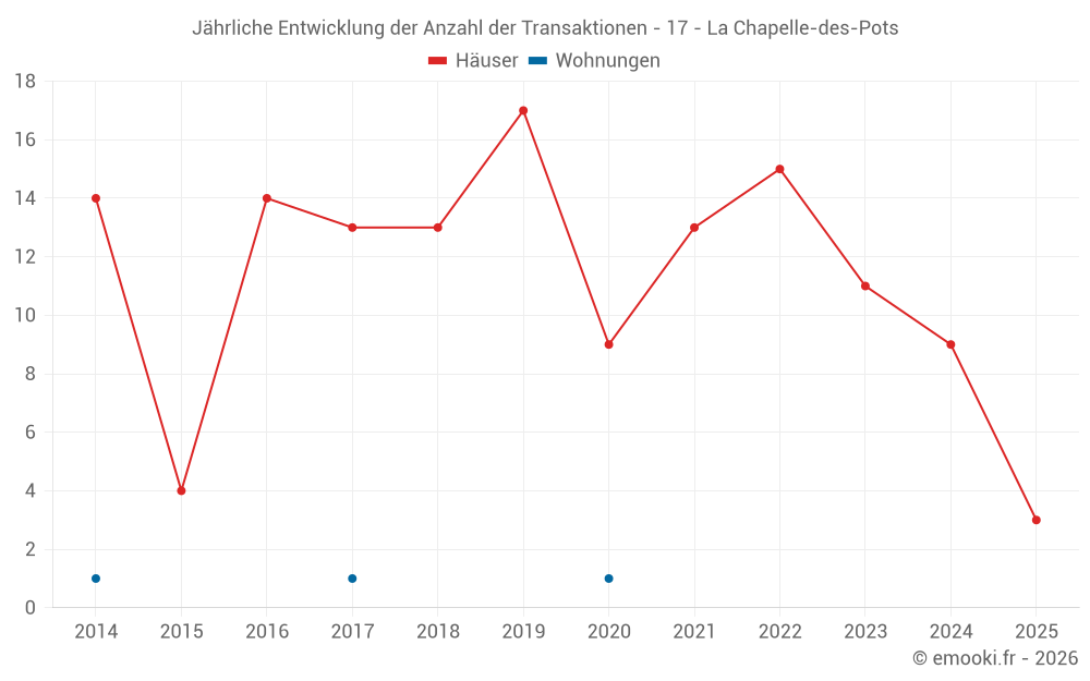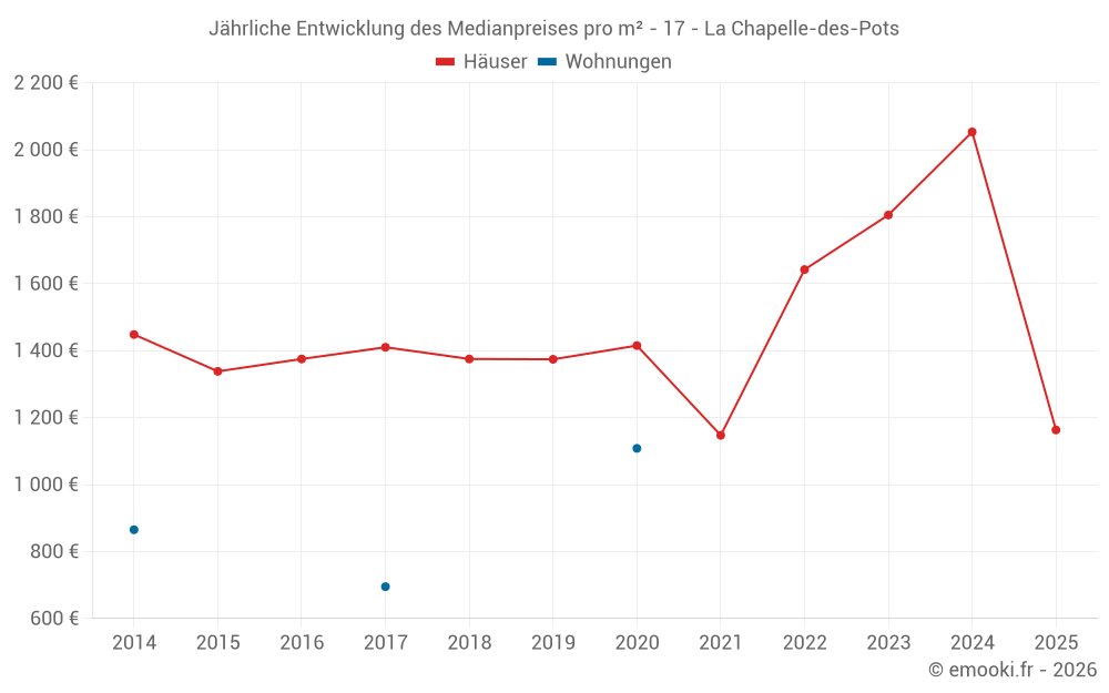 Der Durchschnittspreis auf den 19 Hausgeschäften der letzten 24 Monate in der Gemeinde La Chapelle-des-Pots betrug 1 805 € pro Quadratmeter für einen mittleren Immobilienwert von 176 526 €. Über diesen Zeitraum hinweg lagen 60% der Transaktionen zwischen 1 153 und 2 323 € pro Quadratmeter (vom 2. bis zum 8. Dezil).