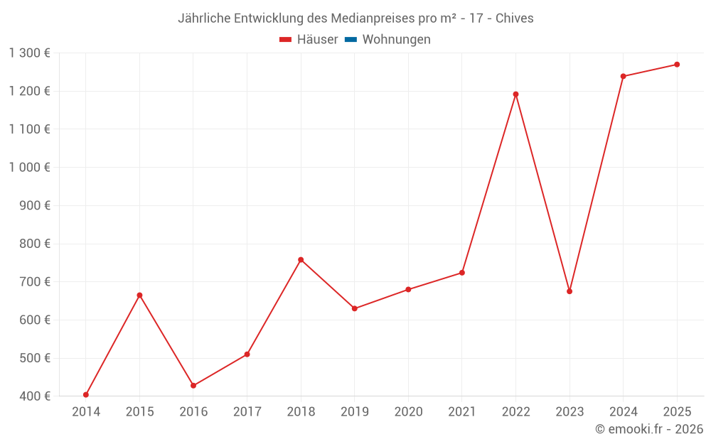 Der Durchschnittspreis auf den 16 Hausgeschäften der letzten 24 Monate in der Gemeinde Chives betrug 1 120 € pro Quadratmeter für einen mittleren Immobilienwert von 93 000 €. Über diesen Zeitraum hinweg lagen 60% der Transaktionen zwischen 432 und 1 474 € pro Quadratmeter (vom 2. bis zum 8. Dezil).