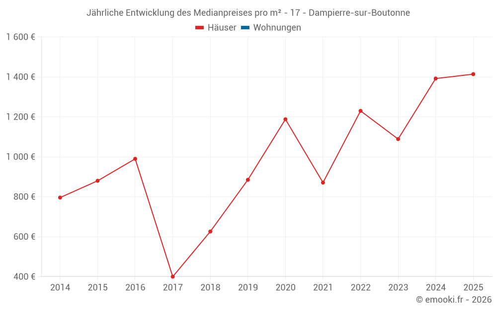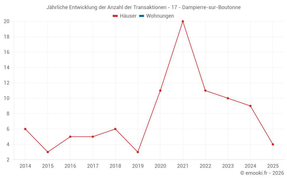 Der Durchschnittspreis auf den 19 Hausgeschäften der letzten 24 Monate in der Gemeinde Dampierre-sur-Boutonne betrug 1 304 € pro Quadratmeter für einen mittleren Immobilienwert von 120 000 €. Über diesen Zeitraum hinweg lagen 60% der Transaktionen zwischen 638 und 1 708 € pro Quadratmeter (vom 2. bis zum 8. Dezil).