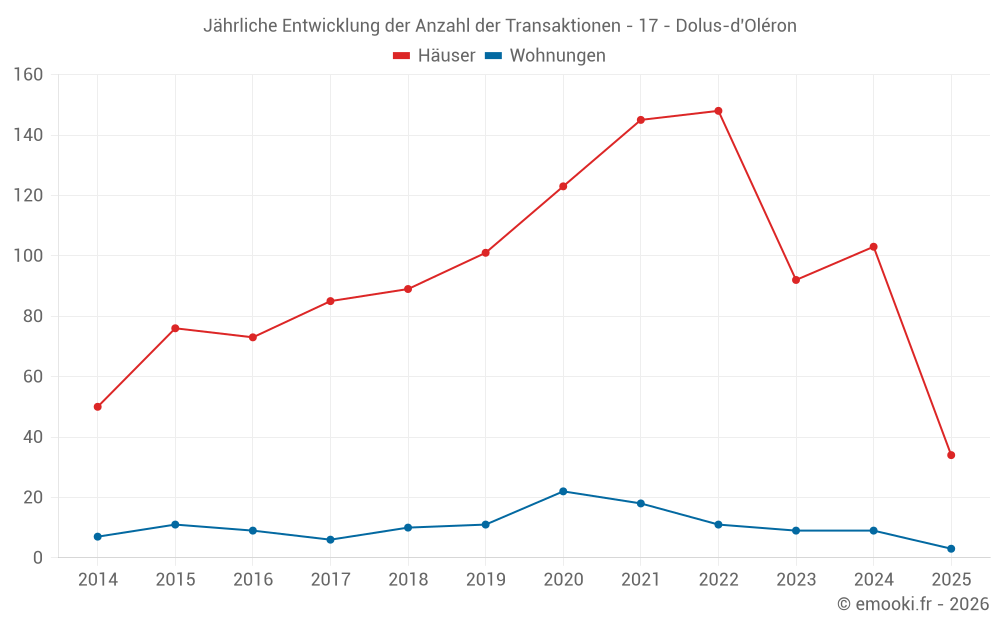 Der Durchschnittspreis auf den 16 Wohnungstransaktionen der letzten 24 Monate in der Gemeinde Dolus-d'Oléron betrug 4 694 € pro Quadratmeter für einen mittleren Immobilienwert von 135 035 €. Über diesen Zeitraum hinweg lagen 60% der Transaktionen zwischen 4 118 und 5 192 € pro Quadratmeter (vom 2. bis zum 8. Dezil).
