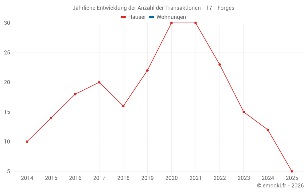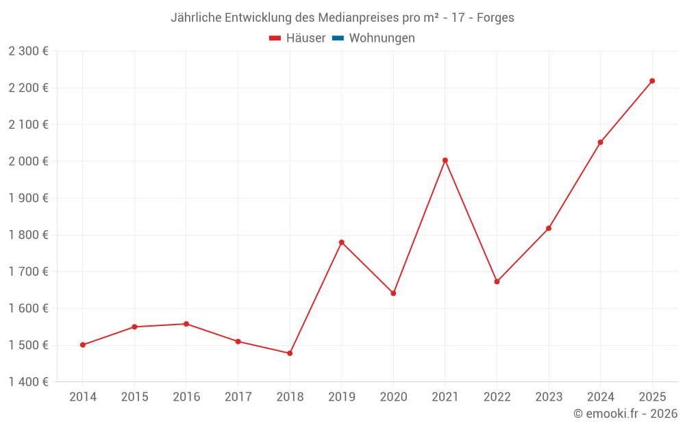 Der Durchschnittspreis auf den 22 Hausgeschäften der letzten 24 Monate in der Gemeinde Forges betrug 2 080 € pro Quadratmeter für einen mittleren Immobilienwert von 210 500 €. Über diesen Zeitraum hinweg lagen 60% der Transaktionen zwischen 1 528 und 2 334 € pro Quadratmeter (vom 2. bis zum 8. Dezil).