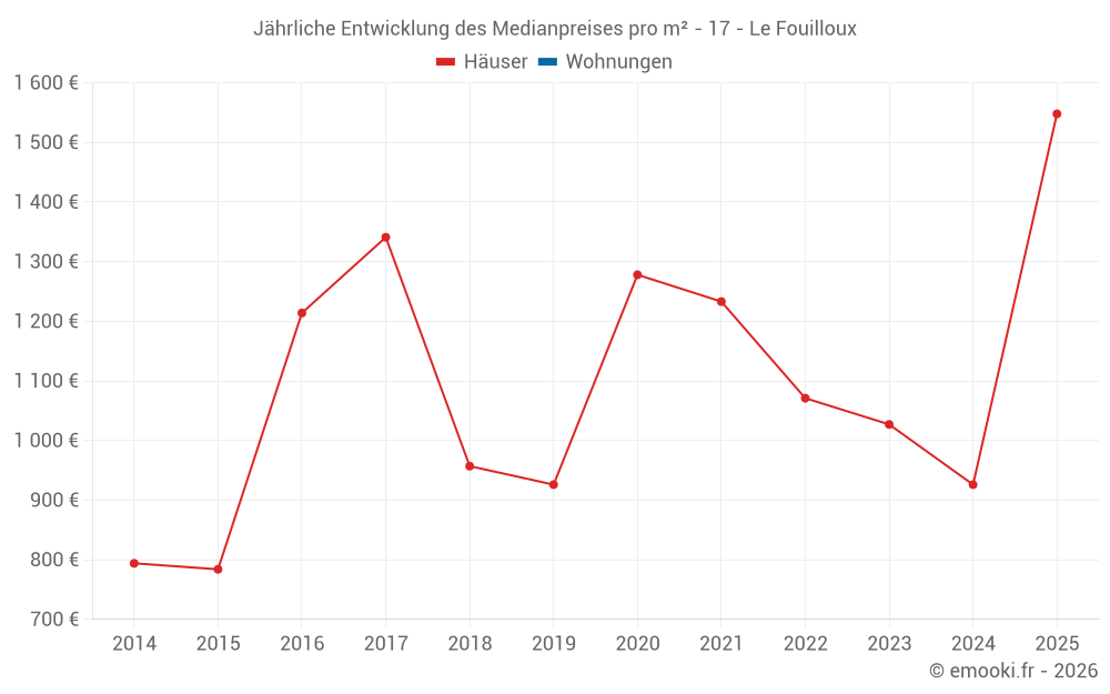 Der Durchschnittspreis auf den 14 Hausgeschäften der letzten 24 Monate in der Gemeinde Le Fouilloux betrug 926 € pro Quadratmeter für einen mittleren Immobilienwert von 126 528 €. Über diesen Zeitraum hinweg lagen 60% der Transaktionen zwischen 600 und 1 499 € pro Quadratmeter (vom 2. bis zum 8. Dezil).