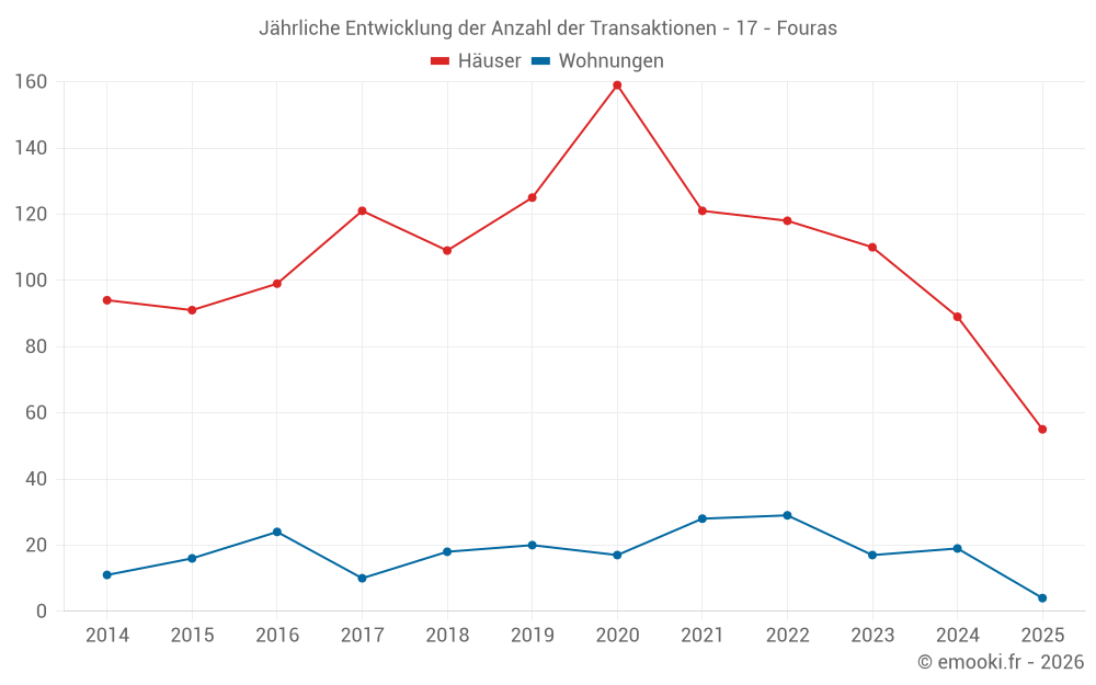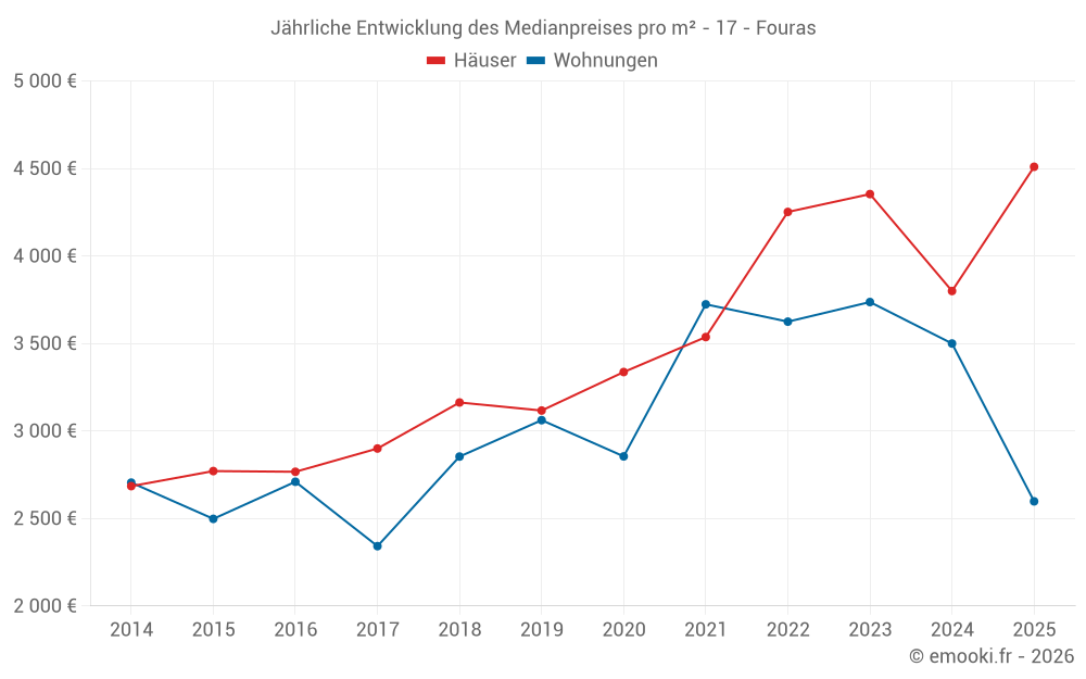 Der Durchschnittspreis auf den 19 Wohnungstransaktionen der letzten 12 Monate in der Gemeinde Fouras betrug 3 333 € pro Quadratmeter für einen mittleren Immobilienwert von 213 000 €. Über diesen Zeitraum hinweg lagen 60% der Transaktionen zwischen 2 570 und 4 139 € pro Quadratmeter (vom 2. bis zum 8. Dezil).
