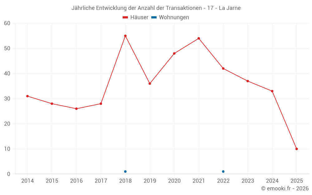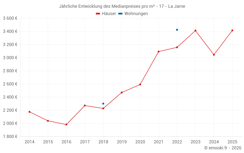 Der Durchschnittspreis auf den 27 Hausgeschäften der letzten 12 Monate in der Gemeinde La Jarne betrug 3 239 € pro Quadratmeter für einen mittleren Immobilienwert von 244 262 €. Über diesen Zeitraum hinweg lagen 60% der Transaktionen zwischen 2 693 und 3 978 € pro Quadratmeter (vom 2. bis zum 8. Dezil).