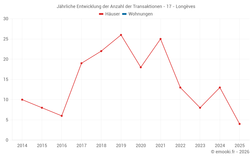 Der Durchschnittspreis auf den 20 Hausgeschäften der letzten 24 Monate in der Gemeinde Longèves betrug 2 503 € pro Quadratmeter für einen mittleren Immobilienwert von 238 012 €. Über diesen Zeitraum hinweg lagen 60% der Transaktionen zwischen 1 685 und 2 826 € pro Quadratmeter (vom 2. bis zum 8. Dezil).