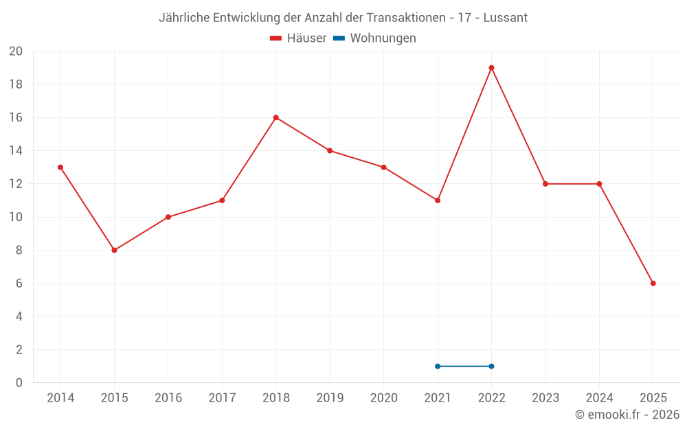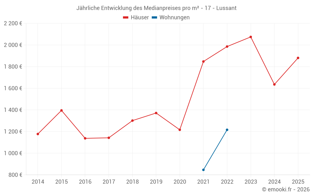 Der Durchschnittspreis auf den 26 Hausgeschäften der letzten 24 Monate in der Gemeinde Lussant betrug 1 870 € pro Quadratmeter für einen mittleren Immobilienwert von 217 100 €. Über diesen Zeitraum hinweg lagen 60% der Transaktionen zwischen 1 537 und 2 200 € pro Quadratmeter (vom 2. bis zum 8. Dezil).