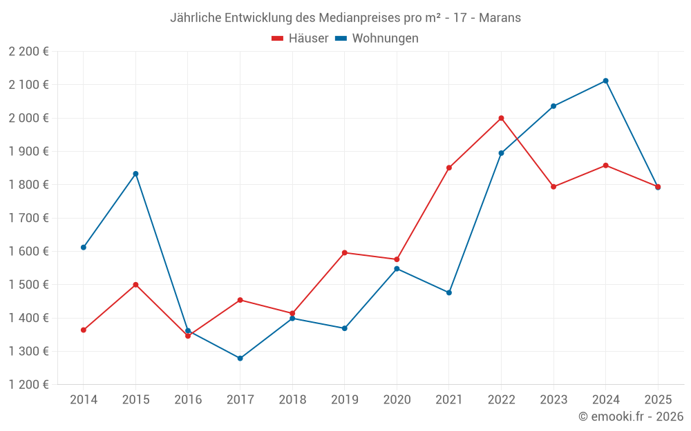 Der Durchschnittspreis auf den 26 Wohnungstransaktionen der letzten 24 Monate in der Gemeinde Marans betrug 2 068 € pro Quadratmeter für einen mittleren Immobilienwert von 100 000 €. Über diesen Zeitraum hinweg lagen 60% der Transaktionen zwischen 1 795 und 2 273 € pro Quadratmeter (vom 2. bis zum 8. Dezil).