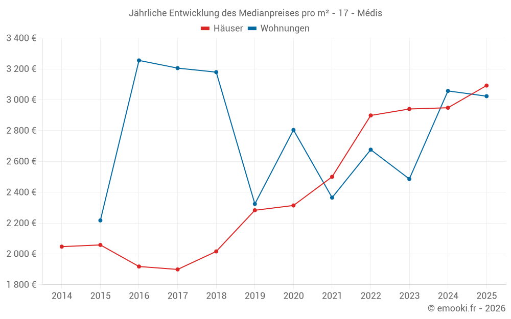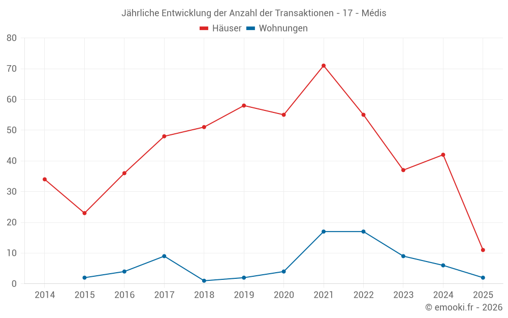 Der Durchschnittspreis auf den 31 Hausgeschäften der letzten 12 Monate in der Gemeinde Médis betrug 3 013 € pro Quadratmeter für einen mittleren Immobilienwert von 318 000 €. Über diesen Zeitraum hinweg lagen 60% der Transaktionen zwischen 2 191 und 3 561 € pro Quadratmeter (vom 2. bis zum 8. Dezil).