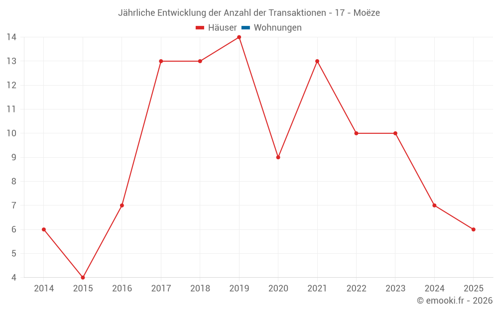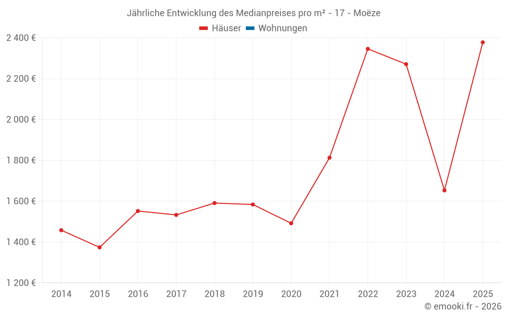 Der Durchschnittspreis auf den 18 Hausgeschäften der letzten 24 Monate in der Gemeinde Moëze betrug 2 216 € pro Quadratmeter für einen mittleren Immobilienwert von 205 765 €. Über diesen Zeitraum hinweg lagen 60% der Transaktionen zwischen 1 499 und 2 650 € pro Quadratmeter (vom 2. bis zum 8. Dezil).