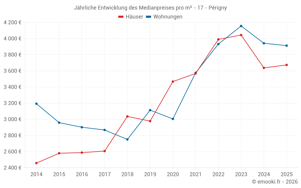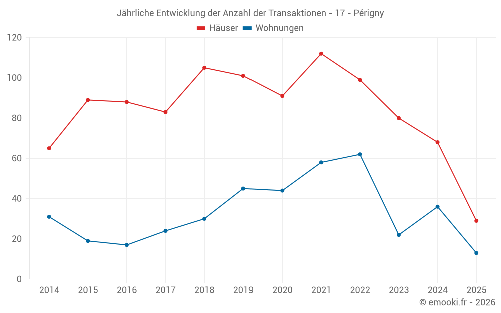 Der Durchschnittspreis auf den 33 Wohnungstransaktionen der letzten 12 Monate in der Gemeinde Périgny betrug 3 976 € pro Quadratmeter für einen mittleren Immobilienwert von 217 000 €. Über diesen Zeitraum hinweg lagen 60% der Transaktionen zwischen 3 586 und 4 418 € pro Quadratmeter (vom 2. bis zum 8. Dezil).