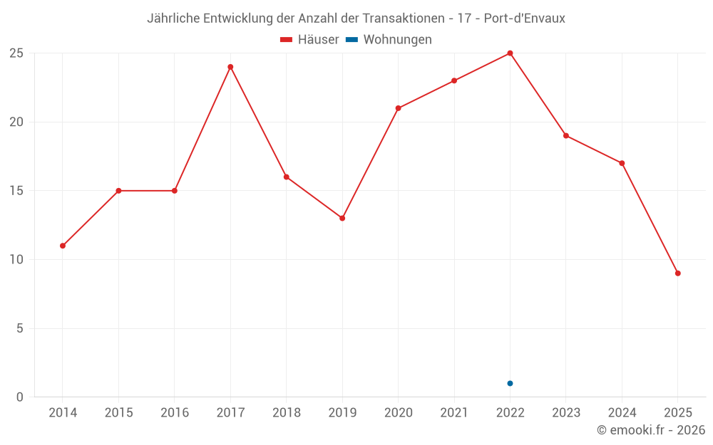Der Durchschnittspreis auf den 18 Hausgeschäften der letzten 12 Monate in der Gemeinde Port-d'Envaux betrug 1 688 € pro Quadratmeter für einen mittleren Immobilienwert von 192 250 €. Über diesen Zeitraum hinweg lagen 60% der Transaktionen zwischen 1 356 und 2 070 € pro Quadratmeter (vom 2. bis zum 8. Dezil).