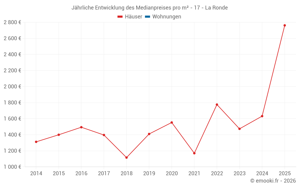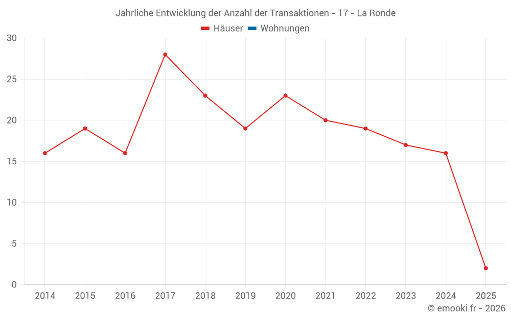 Der Durchschnittspreis auf den 29 Hausgeschäften der letzten 24 Monate in der Gemeinde La Ronde betrug 1 743 € pro Quadratmeter für einen mittleren Immobilienwert von 184 000 €. Über diesen Zeitraum hinweg lagen 60% der Transaktionen zwischen 851 und 2 174 € pro Quadratmeter (vom 2. bis zum 8. Dezil).