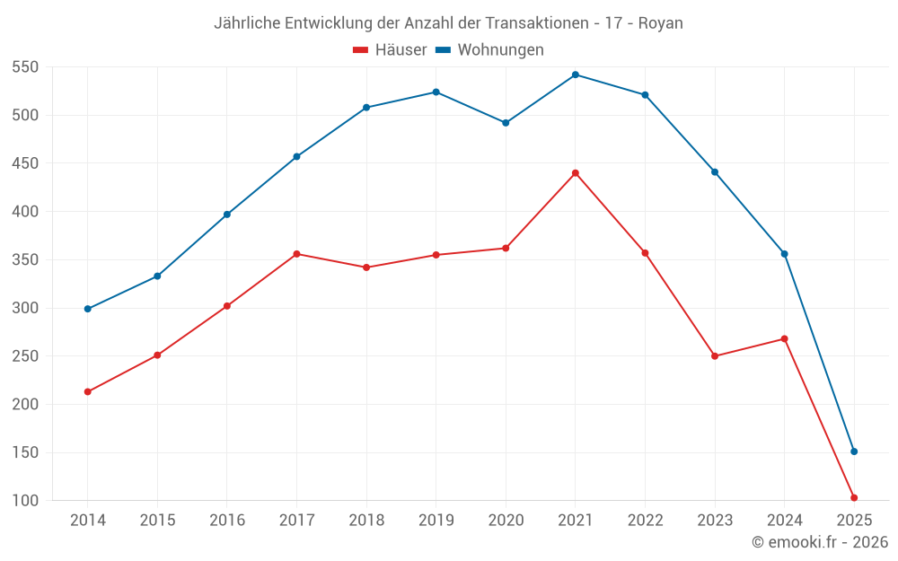 Der Durchschnittspreis auf den 39 Hausgeschäften der letzten 3 Monate in der Gemeinde Royan betrug 3 273 € pro Quadratmeter für einen mittleren Immobilienwert von 285 000 €. Über diesen Zeitraum hinweg lagen 60% der Transaktionen zwischen 2 483 und 4 956 € pro Quadratmeter (vom 2. bis zum 8. Dezil).