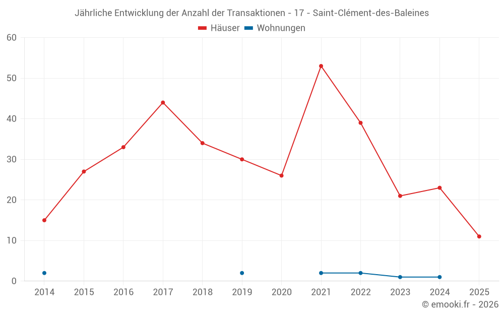 Der Durchschnittspreis auf den 25 Hausgeschäften der letzten 12 Monate in der Gemeinde Saint-Clément-des-Baleines betrug 5 889 € pro Quadratmeter für einen mittleren Immobilienwert von 512 150 €. Über diesen Zeitraum hinweg lagen 60% der Transaktionen zwischen 4 856 und 7 203 € pro Quadratmeter (vom 2. bis zum 8. Dezil).