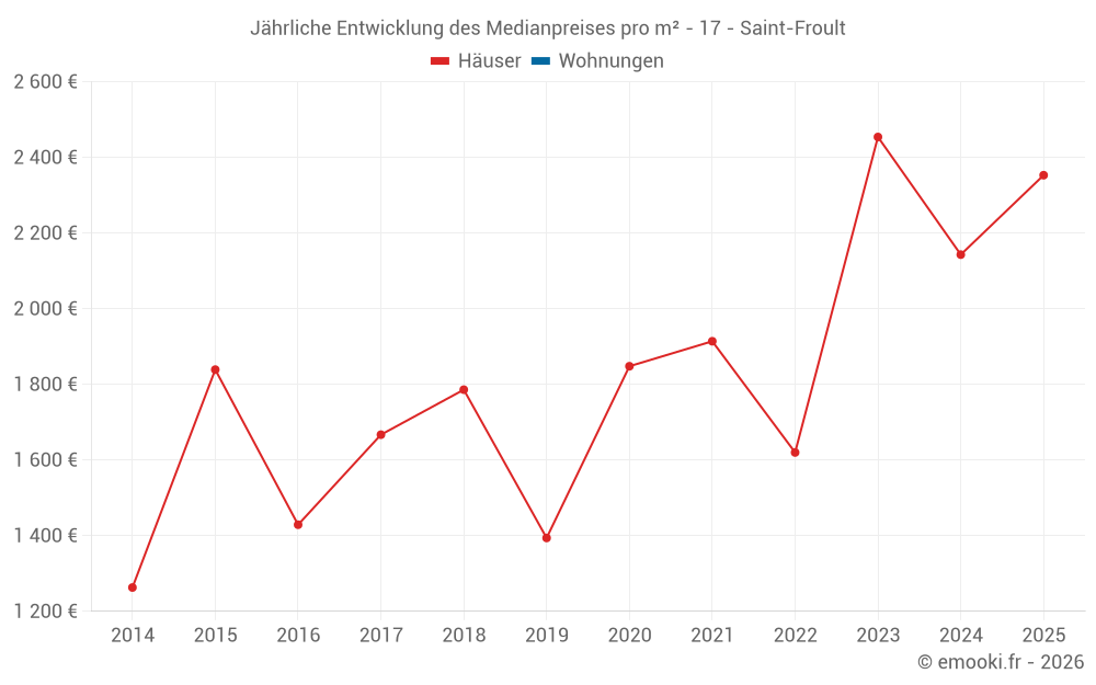 Der Durchschnittspreis auf den 17 Hausgeschäften der letzten 24 Monate in der Gemeinde Saint-Froult betrug 2 216 € pro Quadratmeter für einen mittleren Immobilienwert von 210 000 €. Über diesen Zeitraum hinweg lagen 60% der Transaktionen zwischen 1 494 und 2 604 € pro Quadratmeter (vom 2. bis zum 8. Dezil).